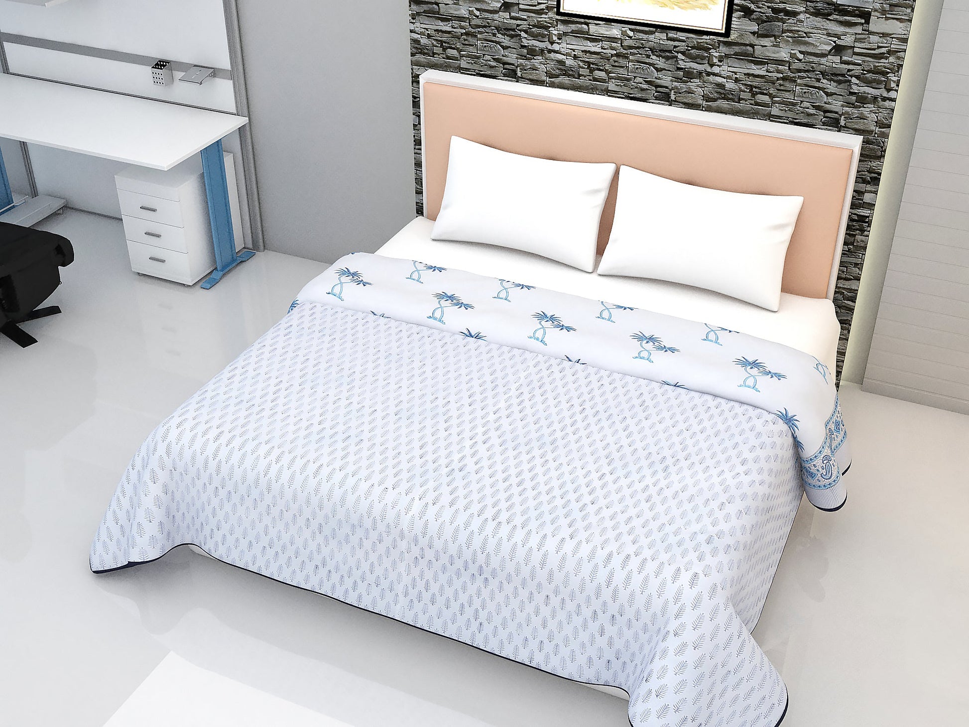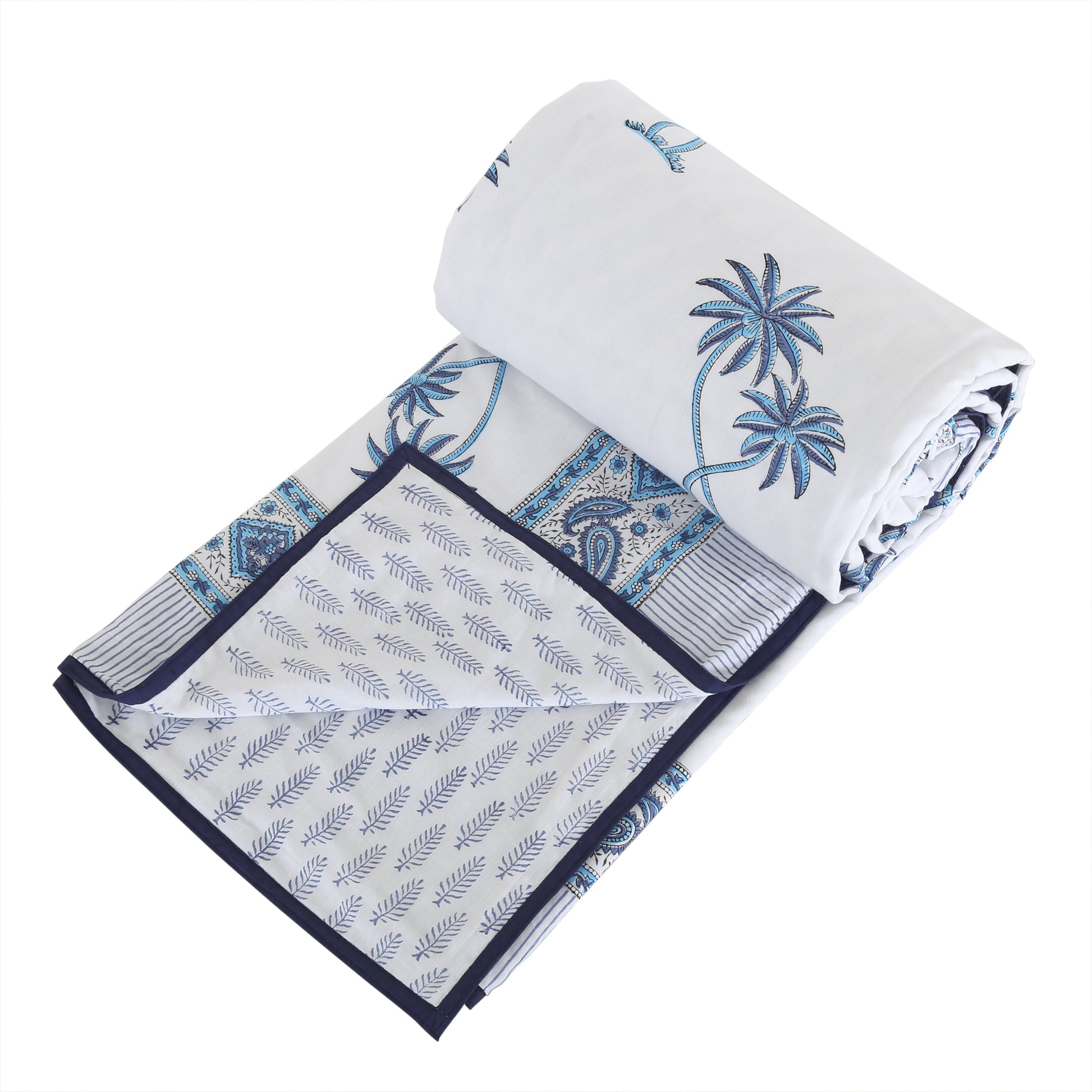 Block Printed Cotton Blanket - Double Dohar ( 90 x 108 Inches) - Blue Coconut Tree