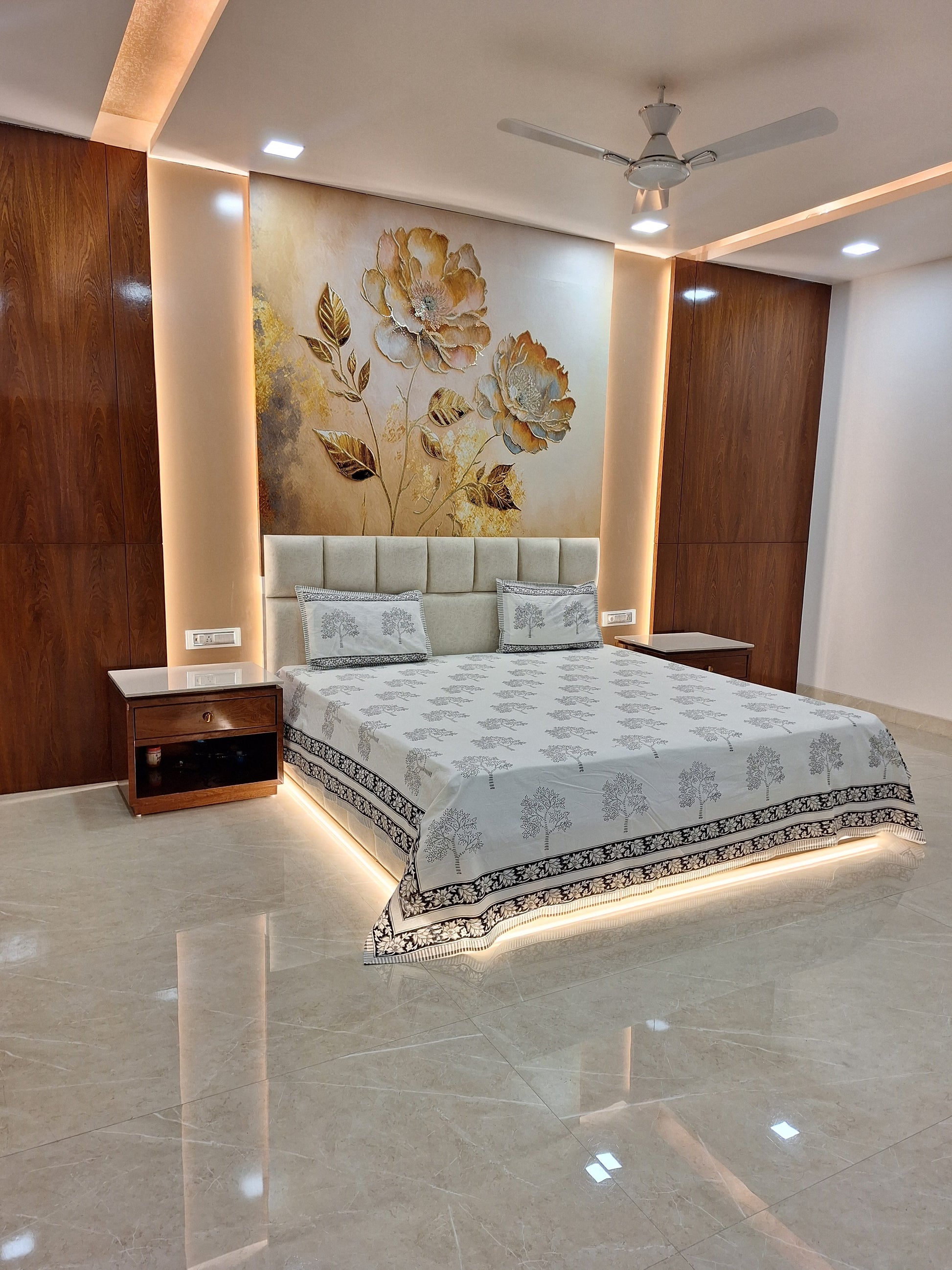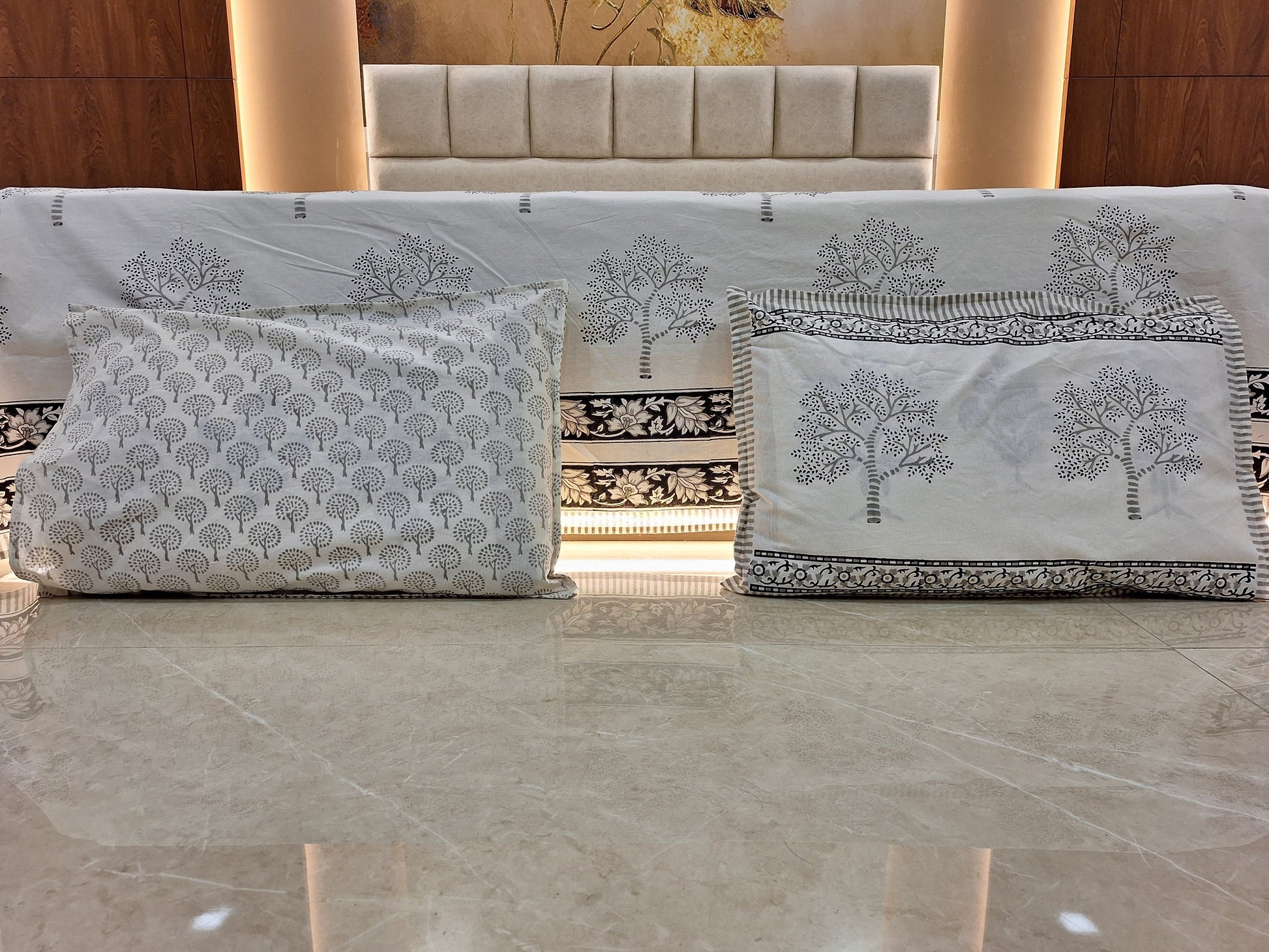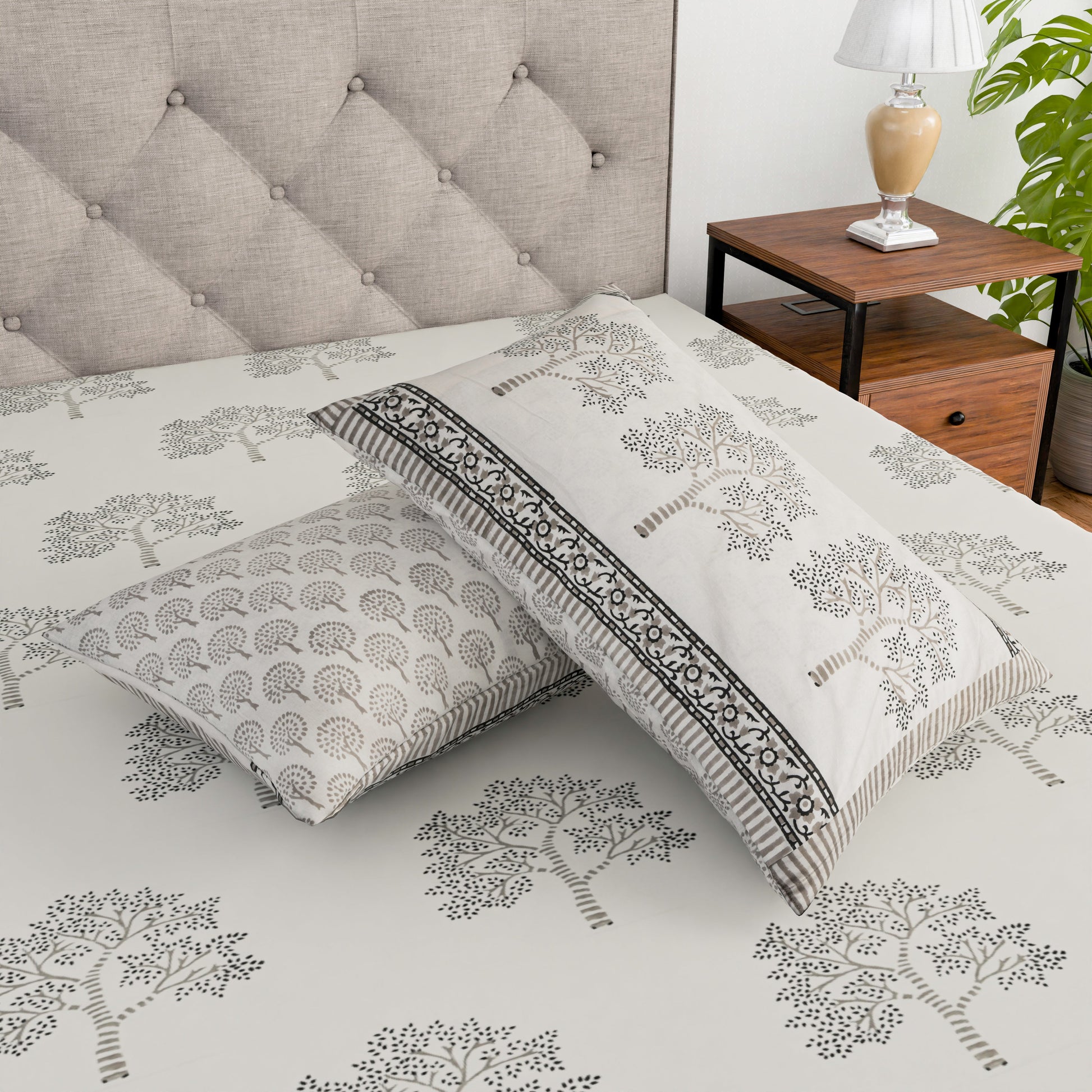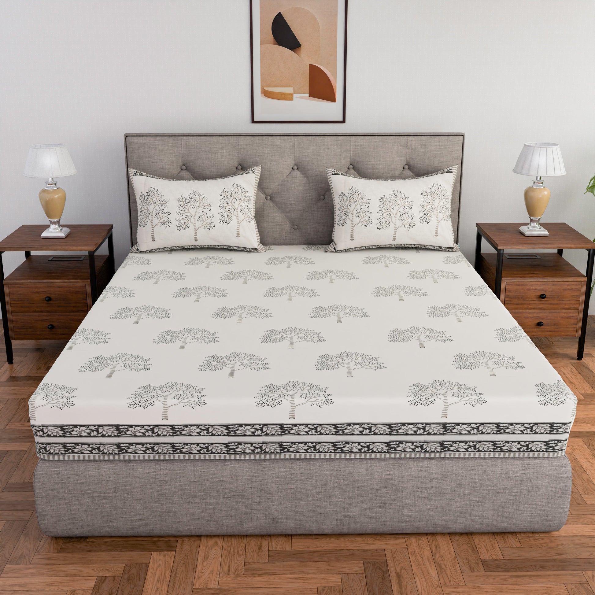 Expertly crafted from pure cotton using traditional hand block printing techniques, this king size bedsheet (100 x 108 inches) features a striking grey tree design. Includes 2 matching pillow covers. Experience comfort and elegance in your bedroom with this high-quality bedding set.