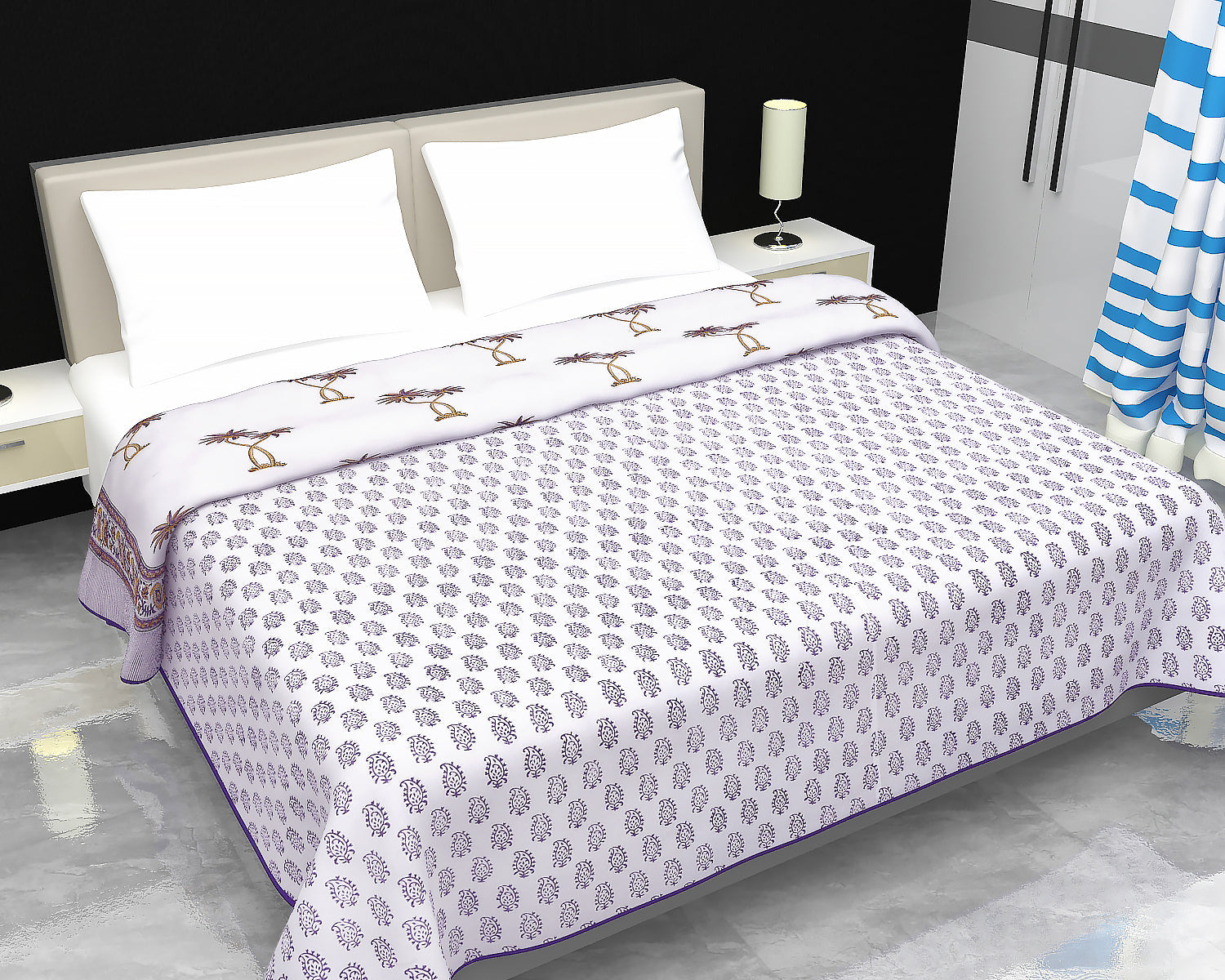 - Blanket Double bed: (90 X 108 Inches) – Pure cotton A/C Dohar - made by hand block printing process.