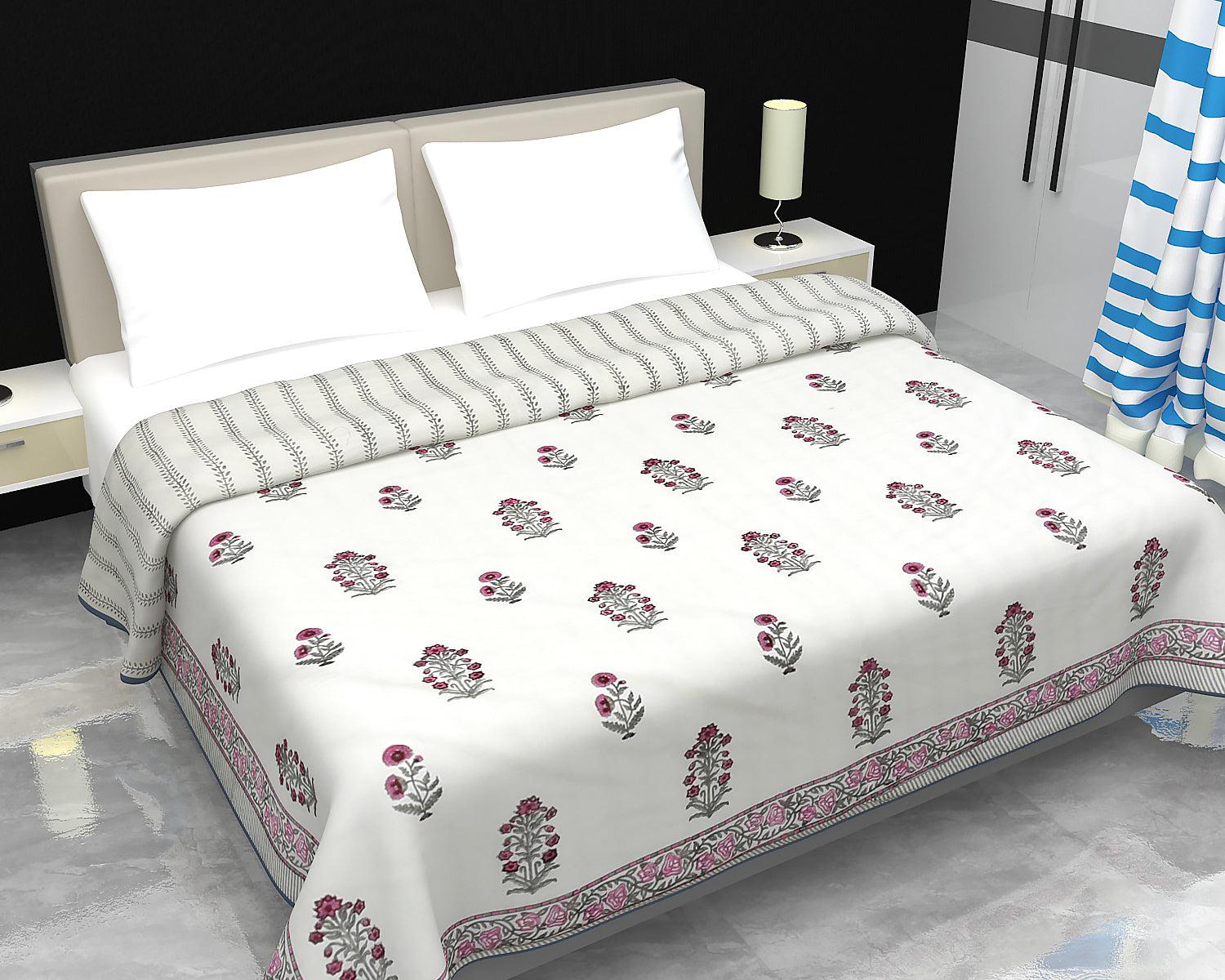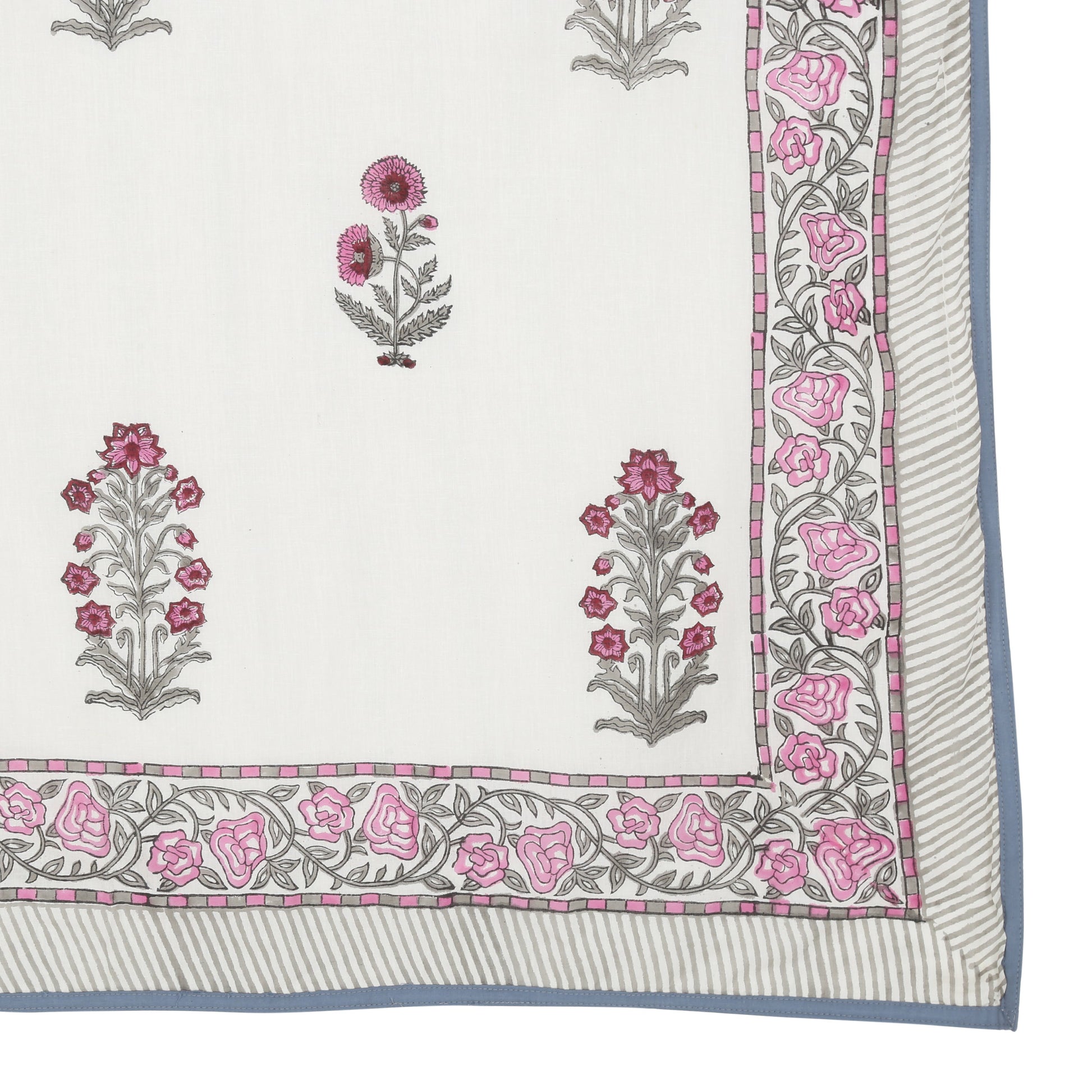 Block Printed Cotton Blanket - Double Dohar ( 90 x 108 Inches) - Pink Grey Plant