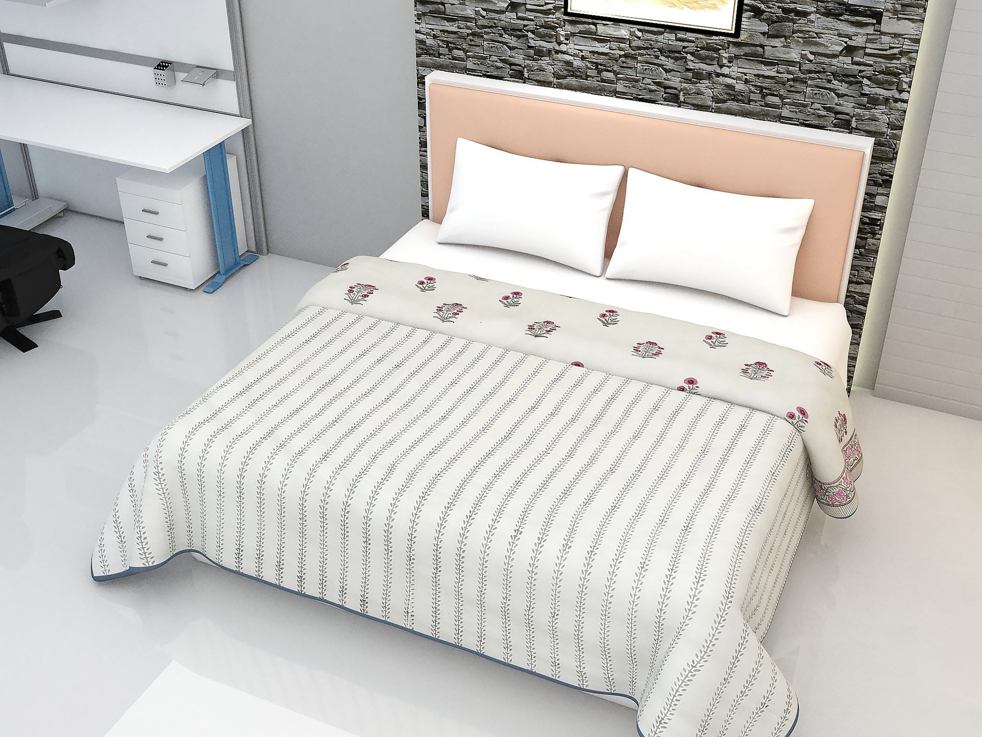 - Blanket Double bed: (90 X 108 Inches) – Pure cotton A/C Dohar - made by hand block printing process.