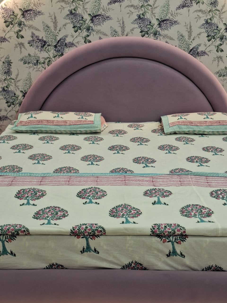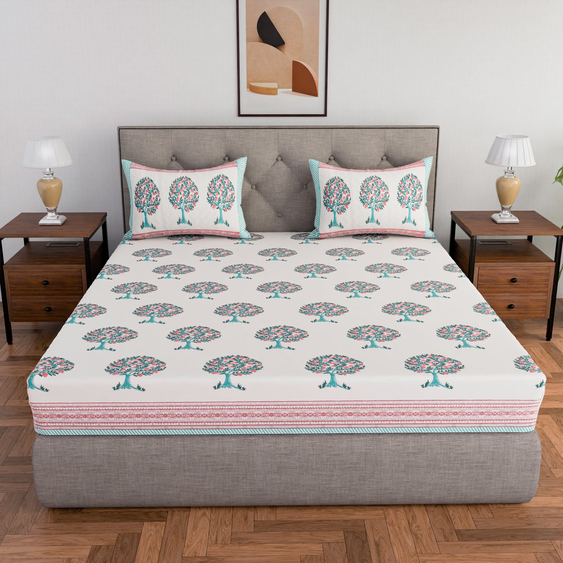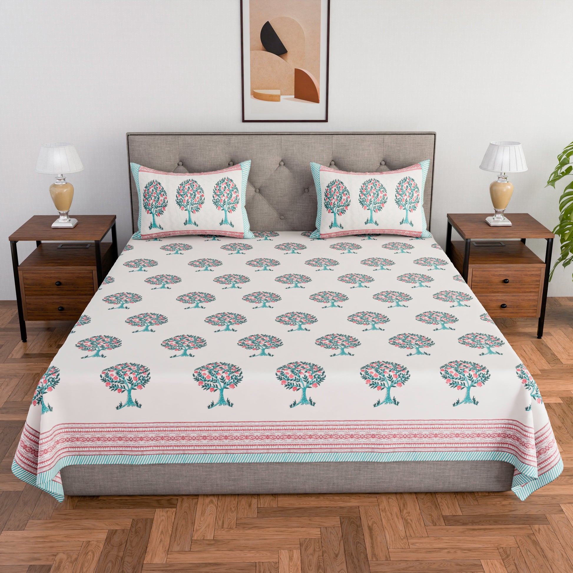 Cotton hand block printed king size bedsheet with pillow covers ( 100 x 108 inches) - Red Green Tree